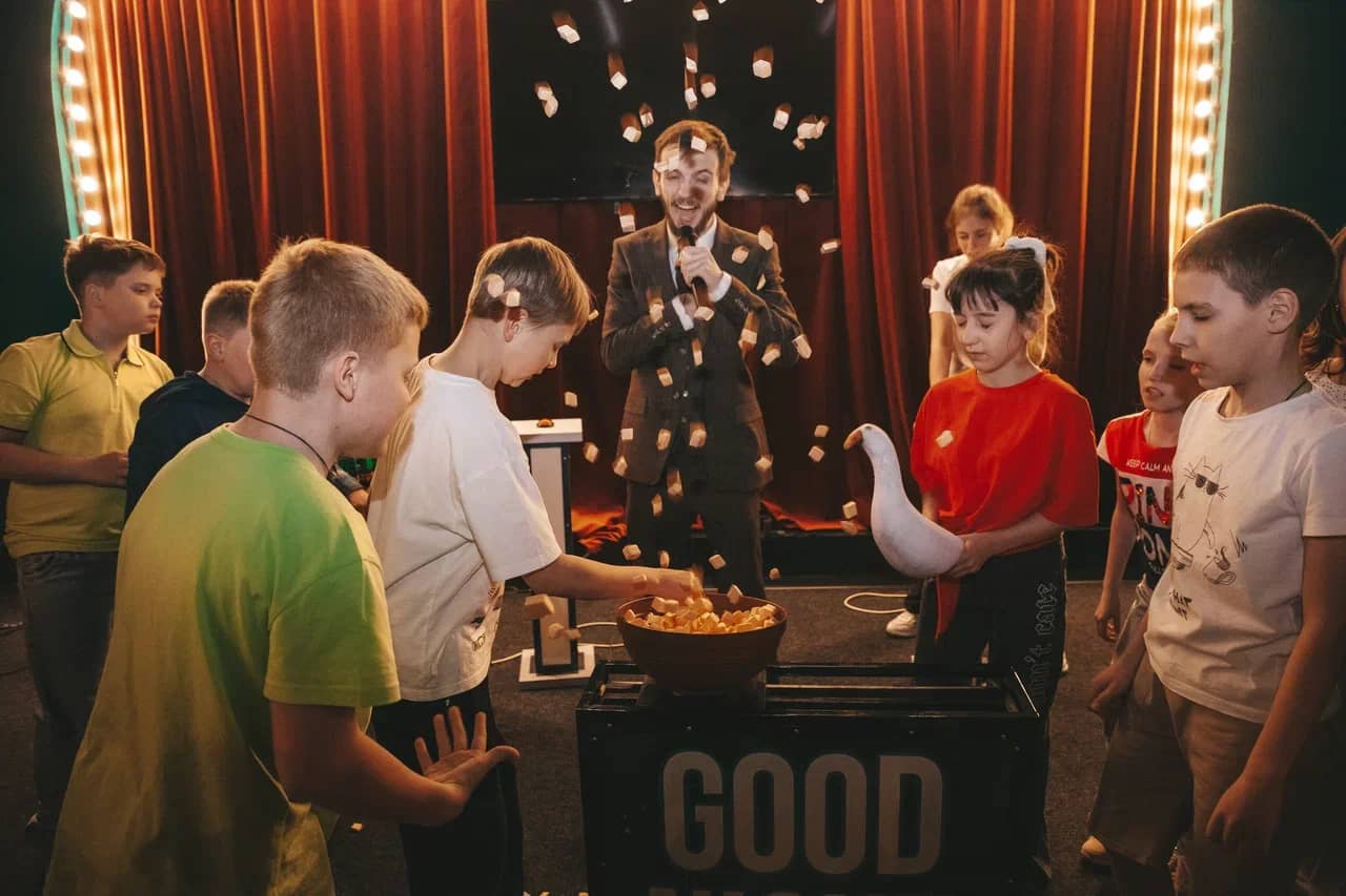 — это интерактивное командное шоу, где гости становятся участниками игры, а не просто зрителями. Мы проводим яркие программы с юмором и харизматичными ведущими. Формат, где за один вечер незнакомцы становятся друзьями, а близкие еще долго пересылают друг другу смешные видео.